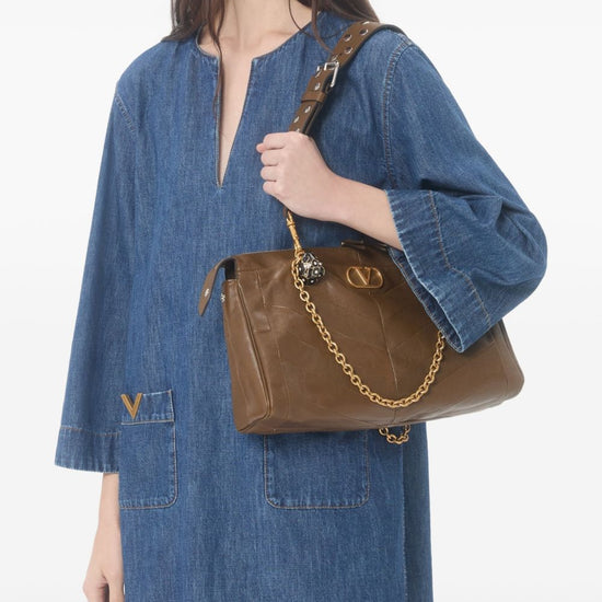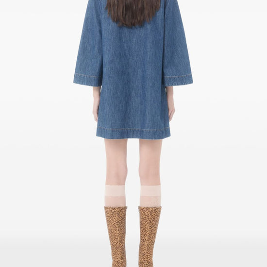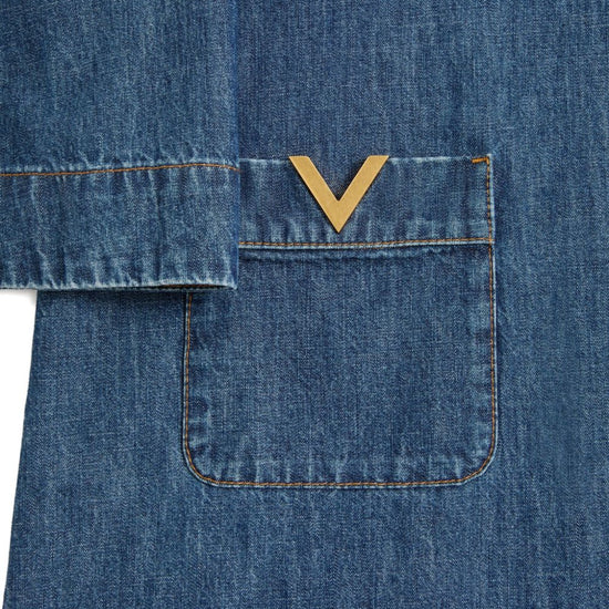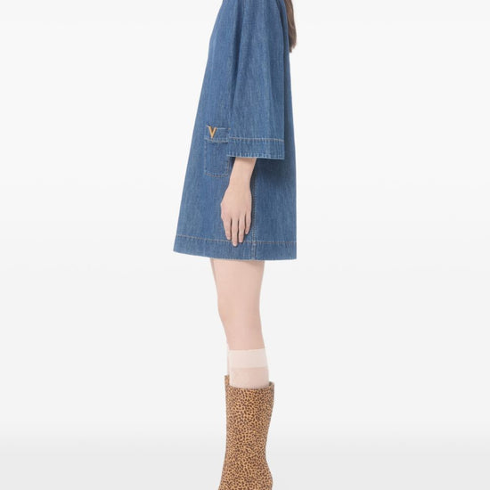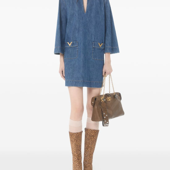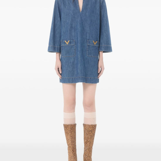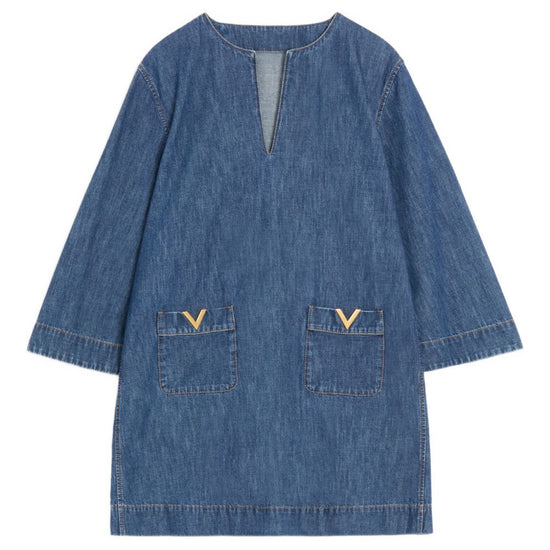 Valentino dress blue v-neck three-quarter sleeves patch pockets logo detail the full look includes valentino garavani accessories. vlogo signature denim short dress
