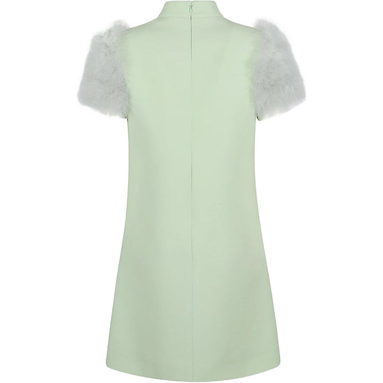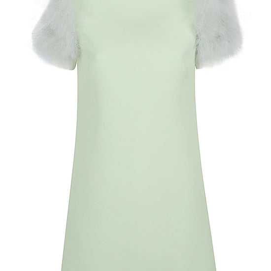 Green, rear zip closure, feather boa detail. feathered wool and silk dress