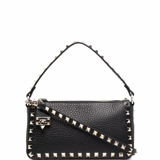 Black calf leather grained texture gold-tone rockstud embellishment single top handle detachable shoulder strap logo print to the front main compartment internal card slot internal logo patch full lining top zip fastening hook fastening rockstud small leather shoulder bag