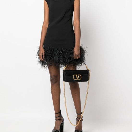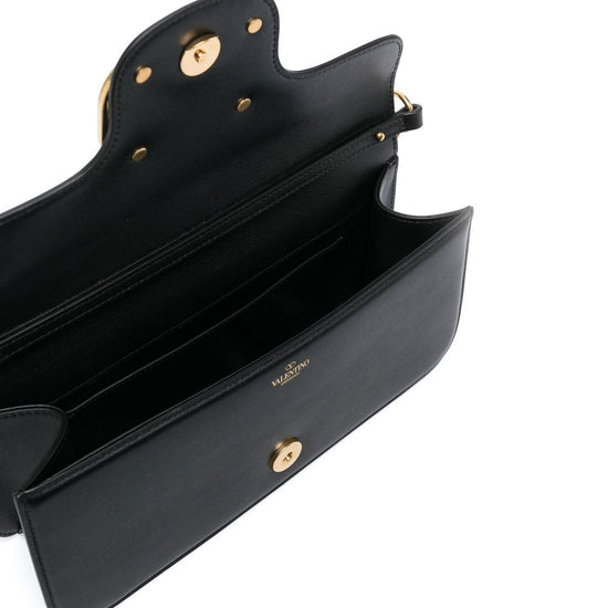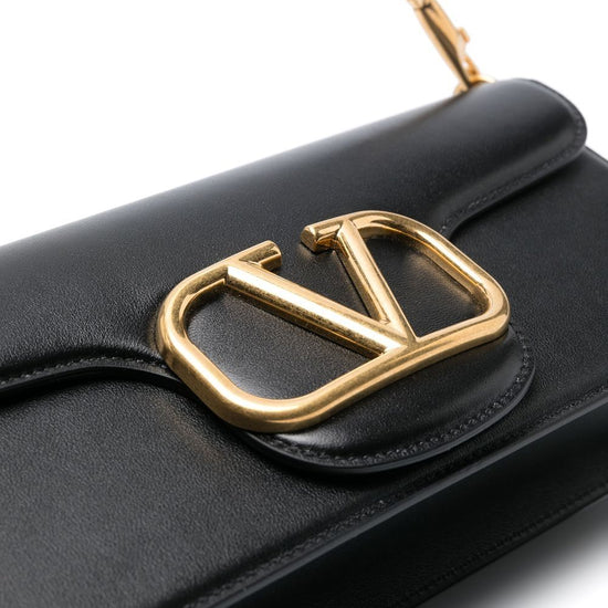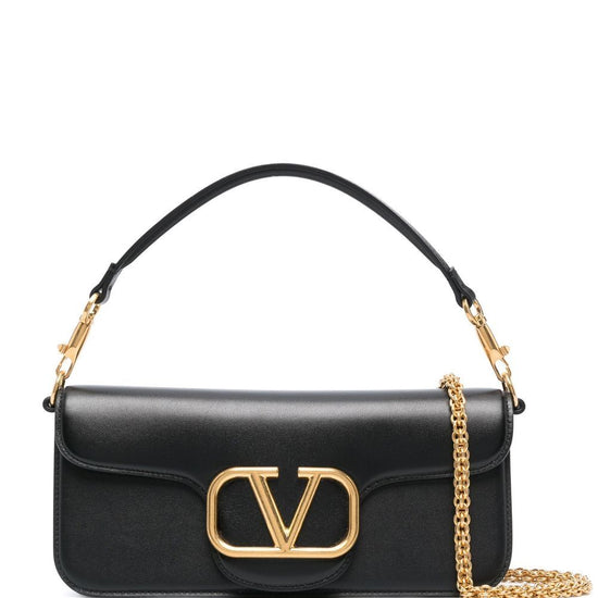 Black calf leather vlogo signature foldover top with press-stud fastening single circular top handle chain-link shoulder strap main compartment internal slip pocket signature v logo plaque locò leather shoulder bag