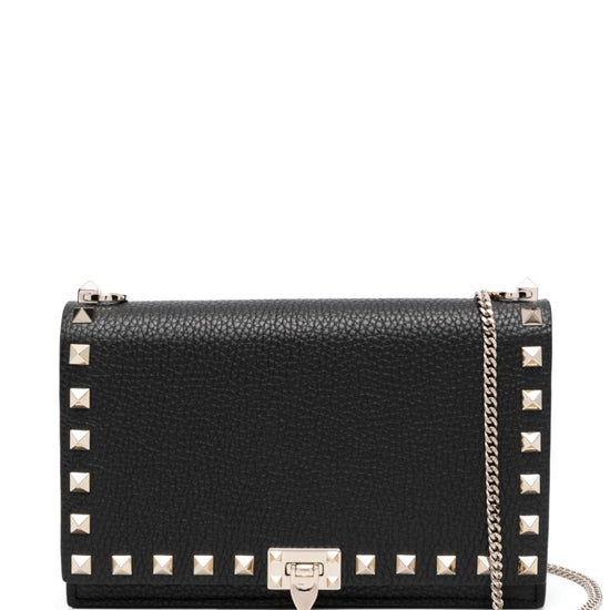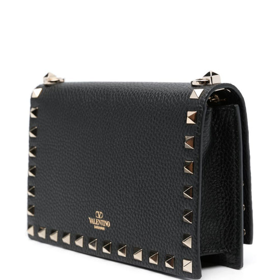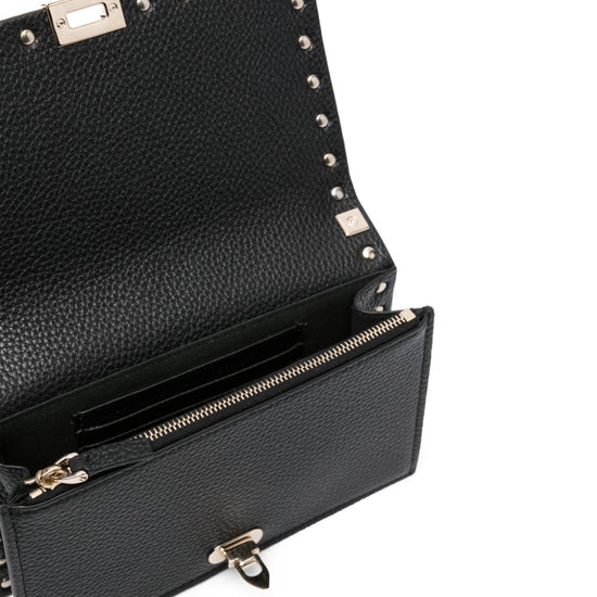 Black calf leather gold-tone rockstud detailing foldover top clasp fastening chain-link shoulder strap internal zip-fastening pocket rockstud leather mini bag