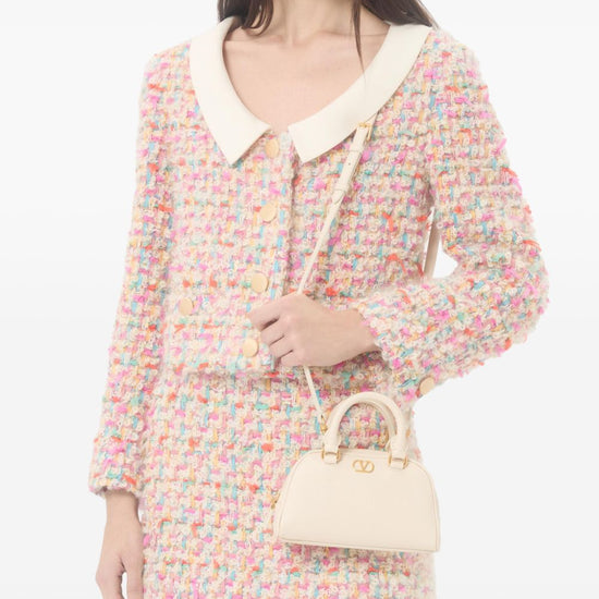 Neutrals, vlogo signature hardware, logo and hardware in antique brass finish, top handles, zipper closure, detachable ajustable shoulder strap, one internal card slot. vlogo signature leather mini bag