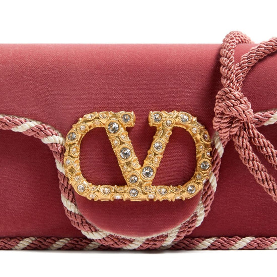 Dusty rose velvet texture braided trim jewel-embellished vlogo clasp magnetic closure tassel detail locò velvet clutch