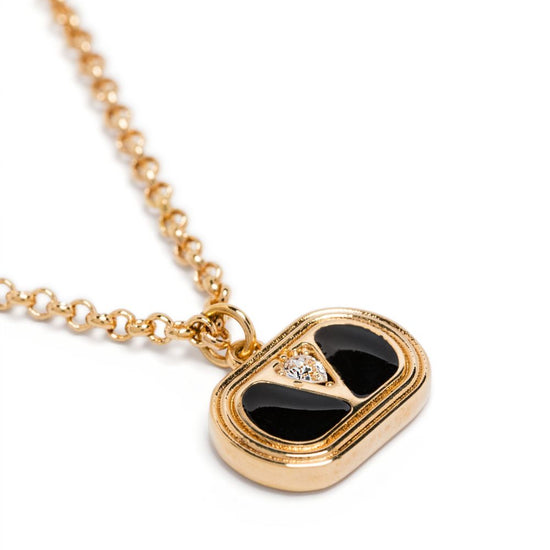 logo plaque vlogo necklace size and fit - length when open: 43.0 centimetres. minimum length: 38.5 centimetres. pendant length: 1.2 centimetres. pendant width: 1.5 centimetres. width: 0.1 centimetres.