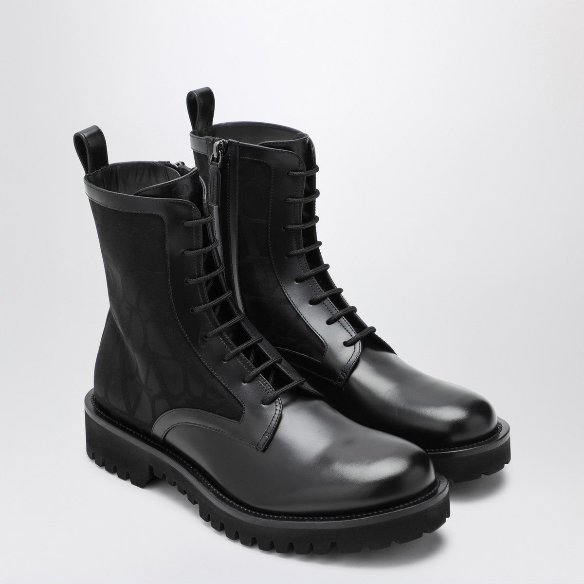 Black calf leather and technical fabric boot by valentino garavani, featuring a toile iconographe pattern, a round toe, a lace-up fastening, a back strap, a side zip and a rubber lug sole.