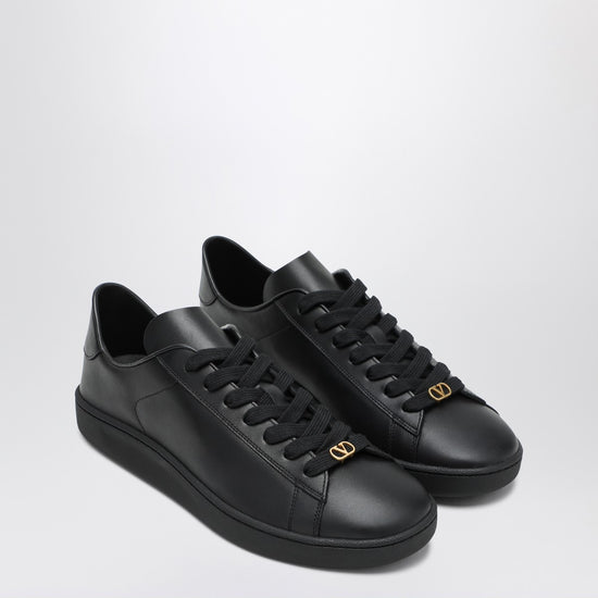 Valentino garavani black calfskin sneakers, characterized by lace-up closure, round toe, heel with logo, vlogo signature detail in metal with an antique brass finish, and rubber sole.