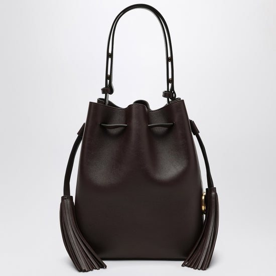 Brown calfskin bucket bag by valentino garavani, featuring a suede lining, drawstring closure with side tassels, a golden vlogo detail on the side, and an adjustable top handle. size and fit - width 23 cm x height 28 cm x depth 14 cm handle drop: 25 cm