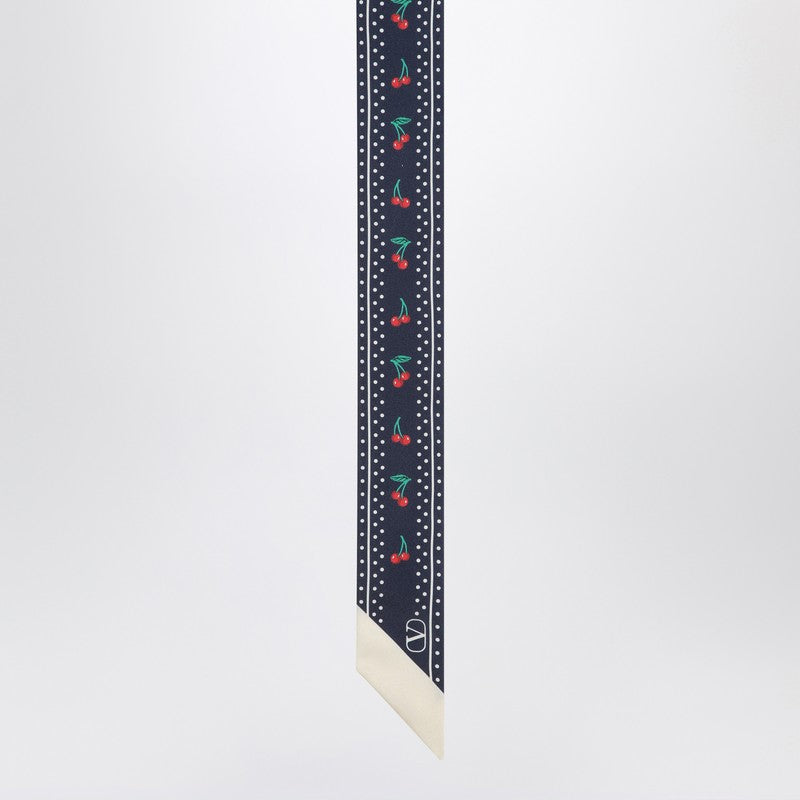 Valentino garavani blue silk scarf with cherries and contrasting all-over polka dots, characterized by ivory edges and a small vlogo signature. size and fit - 6x120 cm