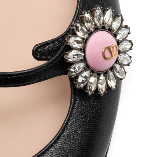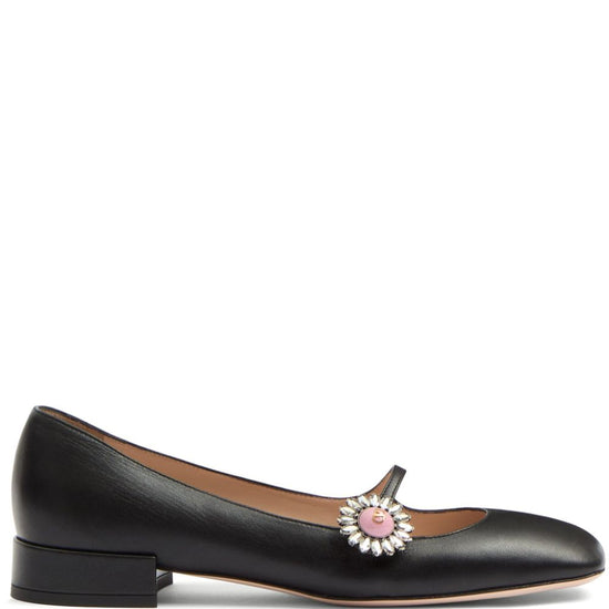 Black calf leather smooth grain buckle-strap fastening crystal embellishment low block heel square toe branded leather insole leather outsole preshoes patent leather ballets