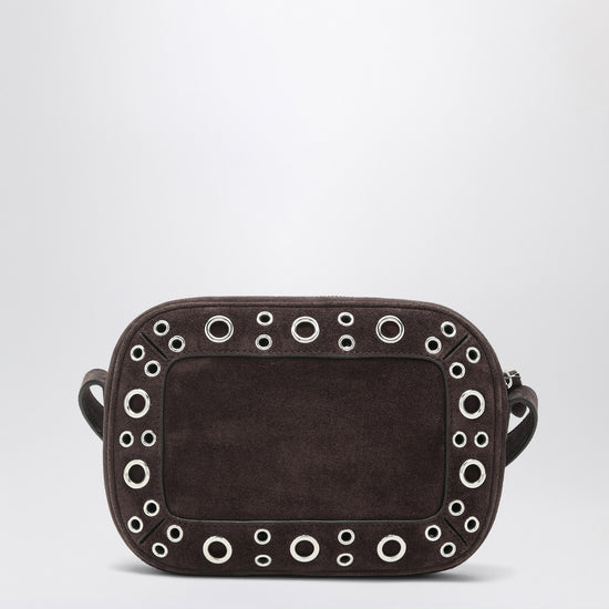 Valentino garavani suede leather bag in dark brown, characterized by a zip closure, a profile decorated with spherical studs and palladium-finished metal rivets, an adjustable shoulder strap, a detail with vlogo signature on the front, and various internal compartments for cards. size and fit - width 23 cm x height 16 cm x depth 6 cm adjustable shoulder strap length min 80 cm - max 100 cm
