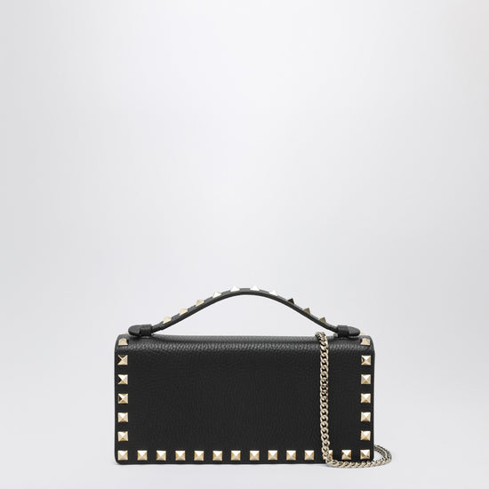 Valentino garavani wallet in black grained leather, featuring a leather handle, removable chain strap, platinum-finish metal studs, flap with magnetic closure, and internal zip pocket. size and fit - width 21 cm x height 9 cm x depth 4,5 cm shoulder strap length 100 cm