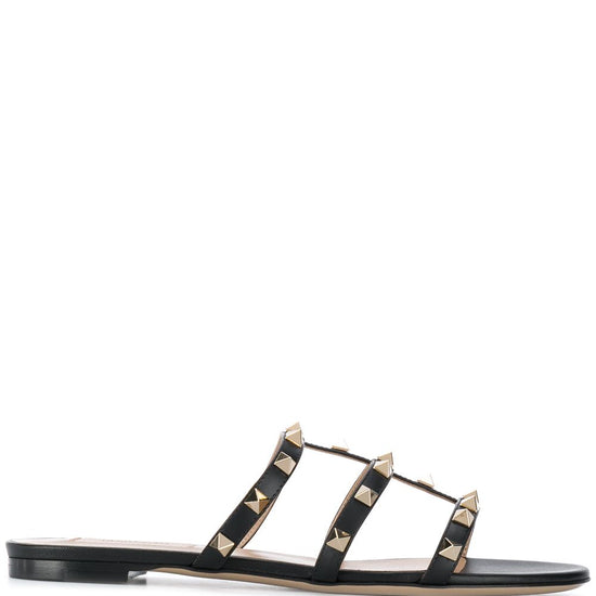 Black leather upper rockstud embellishment three straps flat sole open toe rockstud leather sandals