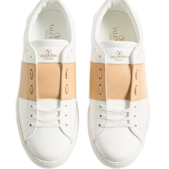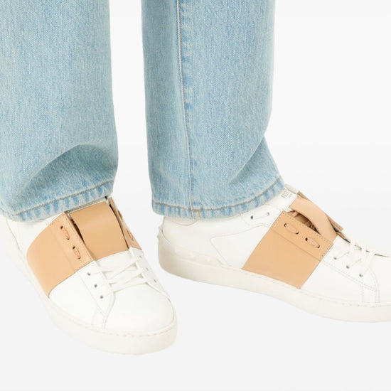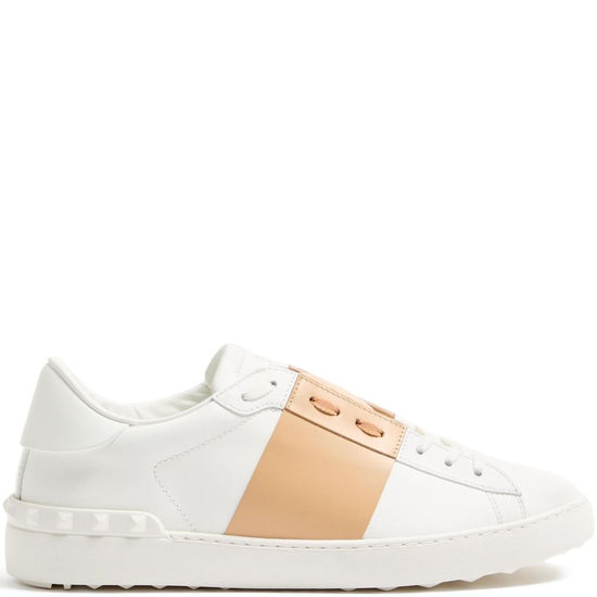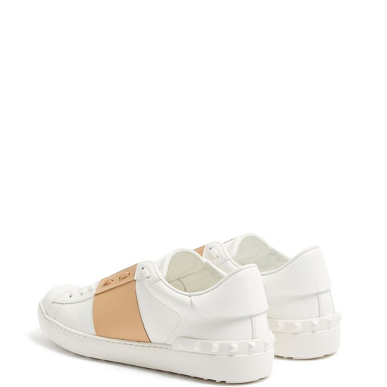 White leather rubber sole rear stud detail lace-up fastening round toe open leather sneakers