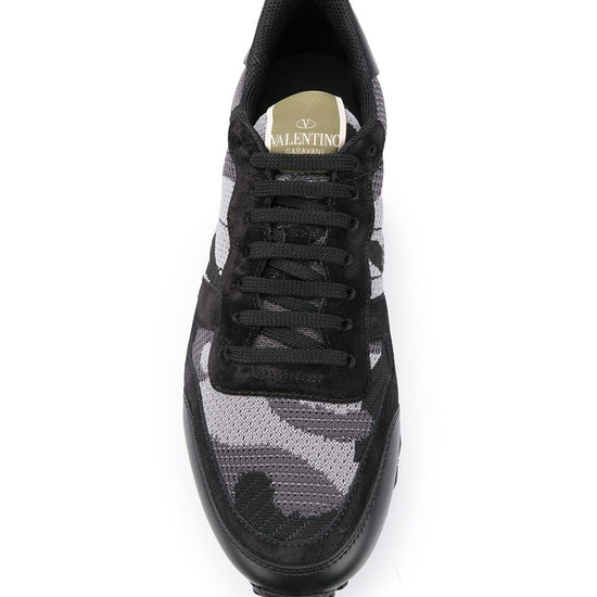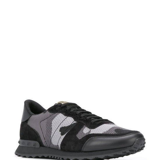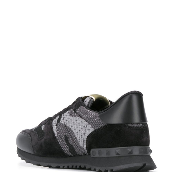 Black suede trims camouflage pattern signature rubber rockstud embellishments logo patch at the tongue front lace-up fastening round toe ridged rubber sole rockrunner sneakers
