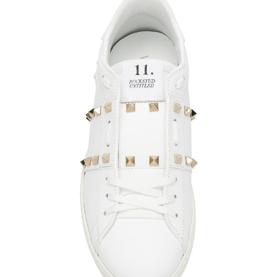 Rockstud untitled sneakers from valentino featuring white, calf leather, round toe, front lace-up fastening, tonal stitching, logo-embossed tongue, branded insole, padded ankle, silver-tone rockstud embellishment and ridged rubber sole. untitled rockstud untitled leather sneakers size and fit - heel 1,2 in / 3 cm; platform 1 in / 2,5 cm