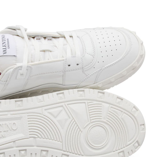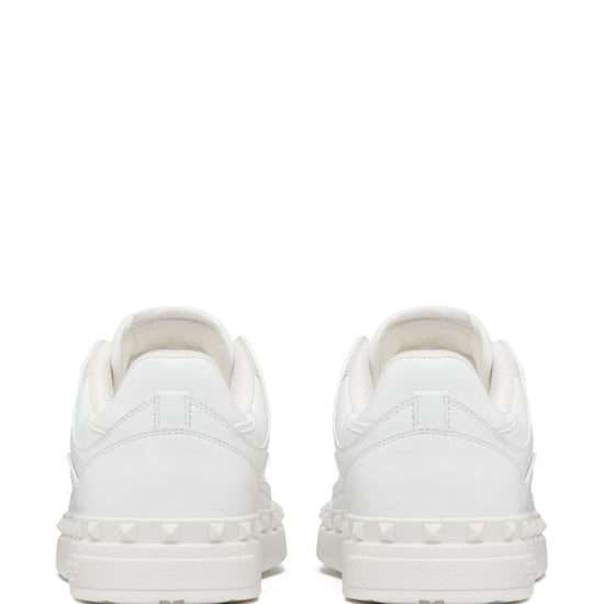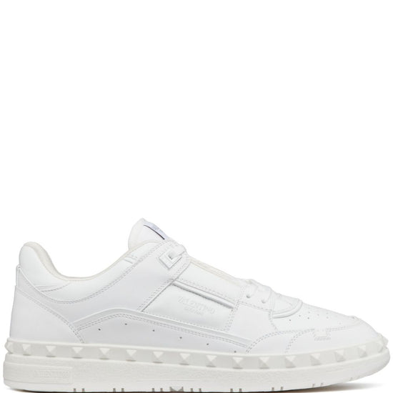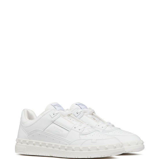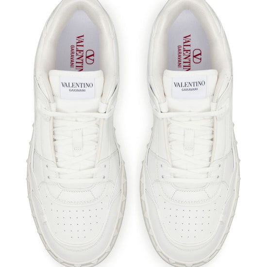 White, calf leather, panelled design, signature rockstud detailing, embossed logo to the side, logo patch at the tongue, perforated toebox, round toe, front lace-up fastening, flat rubber sole. freedots leather sneakers size and fit - heel 2,5 cm