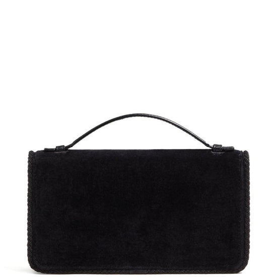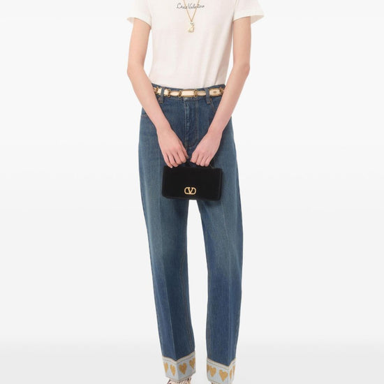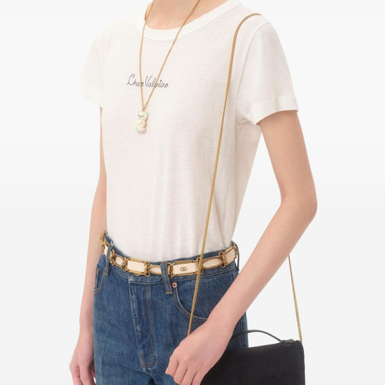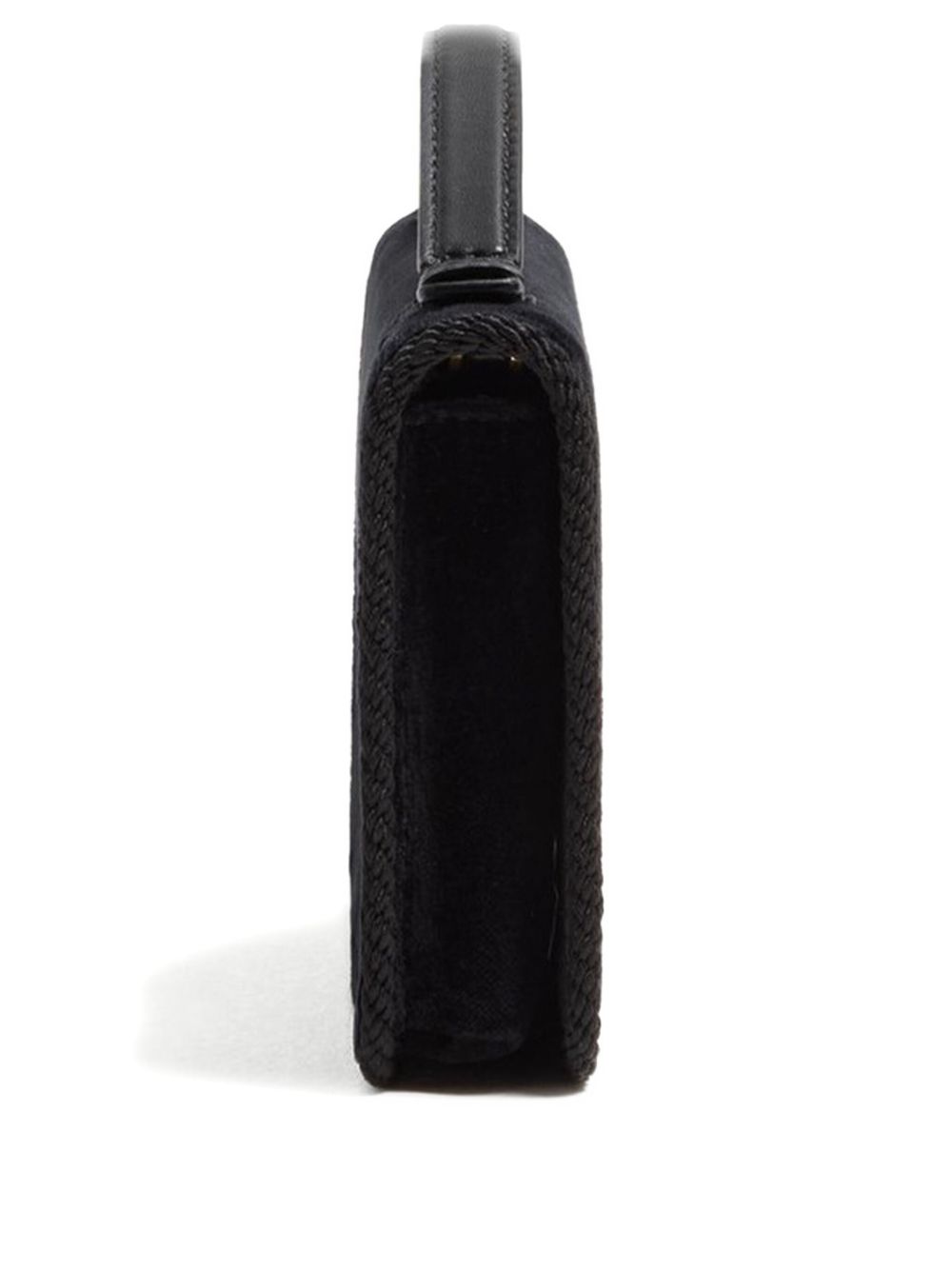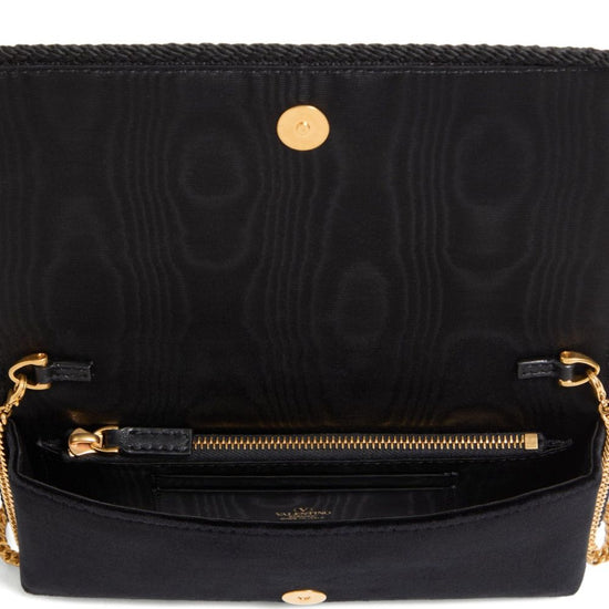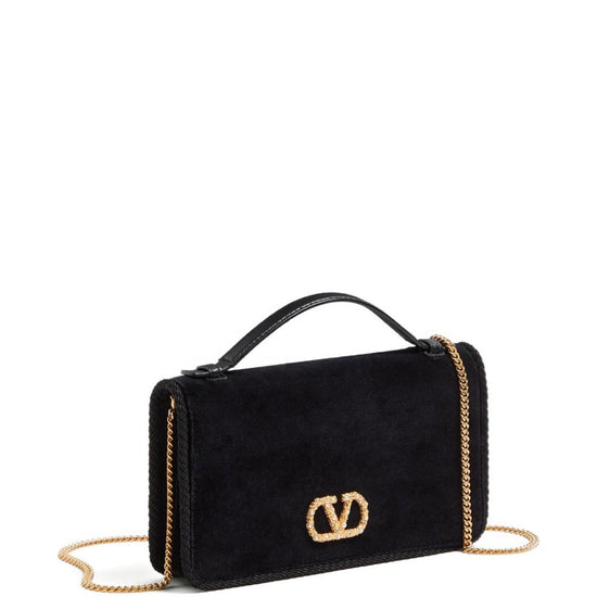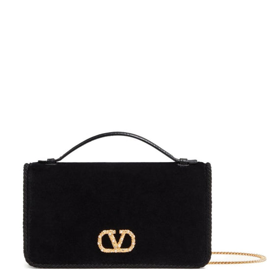 Black front logo plaque chain shoulder strap top handle tonal stitching vlogo signature velvet wallet on chain
