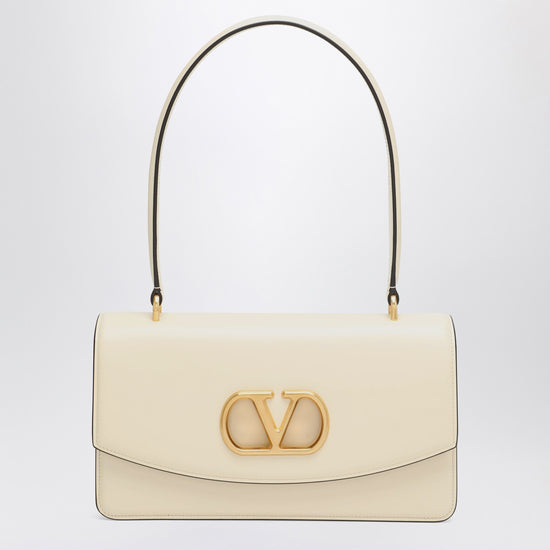 Valentino garavani handbag in shiny butter white calfskin, characterized by a top handle, antique gold finish metal parts, magnetic flap closure with vlogo on the front, leather lining, one internal zip pocket, and one internal flat pocket. size and fit - width 24 cm x height 16 cm x depth 8 cm adjustable shoulder strap length min 54 cm - max 104 cm