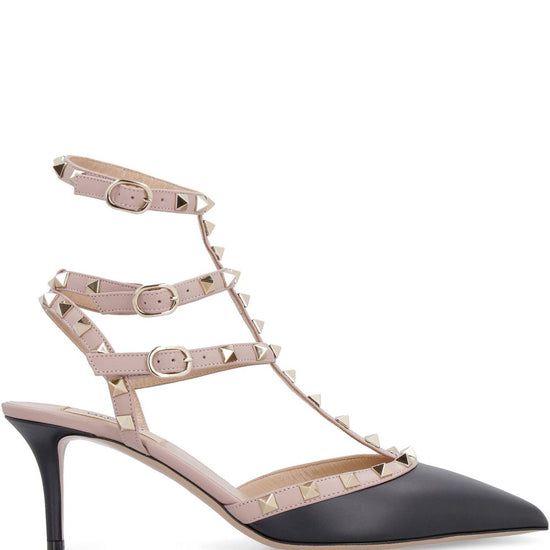 Black leather gold-tone rockstud detailing pointed toe cage construction buckle-fastening ankle straps low heel rockstud leather pumps size and fit - heel: 7.0 centimetres.