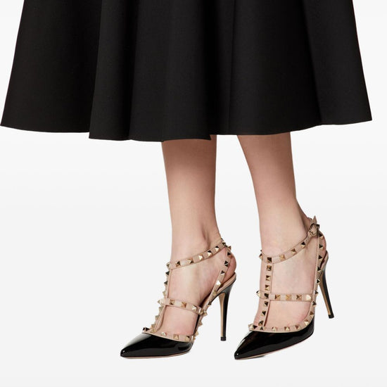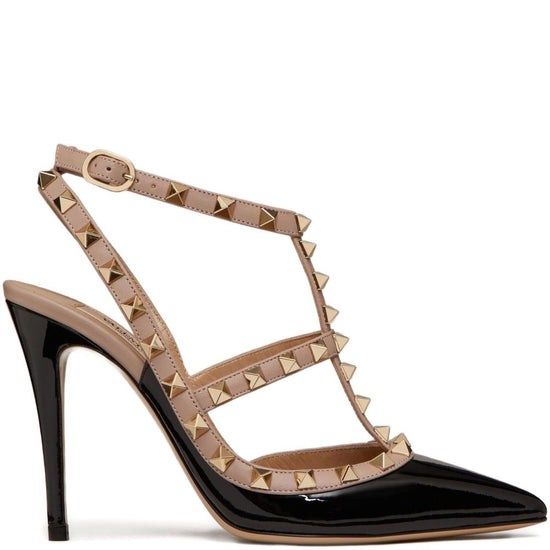 Black/powder pink calf leather patent finish contrasting grained trim gold-tone rockstud embellishment caged design pointed toe branded footbed leather lining 100mm high stiletto heel leather sole buckle-fastening ankle strap this piece comes complete with a protective dust bag. rockstud patent leather pumps size and fit - heel: 10.0 centimetres.