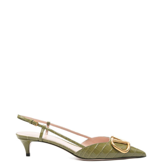 Green embossed crocodile effect pointed toe gold-tone logo plaque kitten heel slingback strap vlogo signature leather slingback pumps