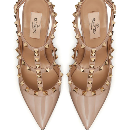 Powder pink patent leather gold-tone rockstud embellishment ankle strap pointed toe side buckle fastening branded leather insole 100mm stiletto heel rockstud patent leather pumps size and fit - heel: 10.0 centimetres.