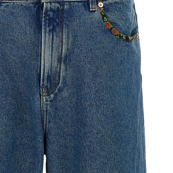 Blue floral print inserts zip fly five pockets logo patch to the rear embroidered denim jeans