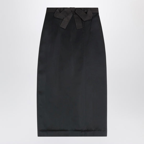 Midi skirt by valentino garavani in black satin with crinkled pressed effect, bow at the waist, back zip and hook closure, and unfinished hem.