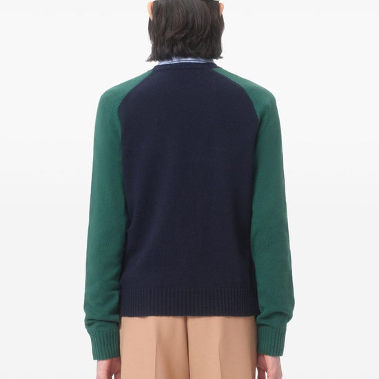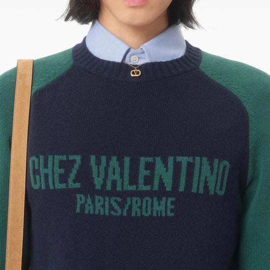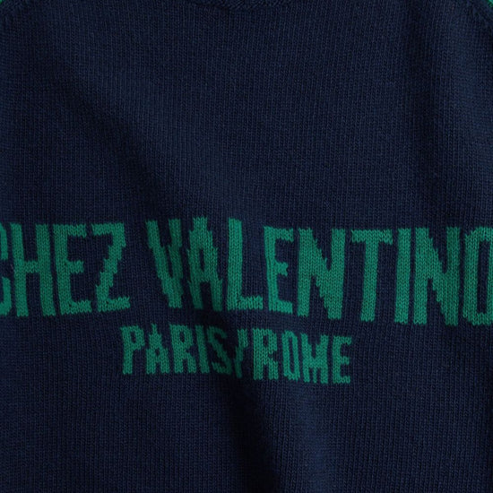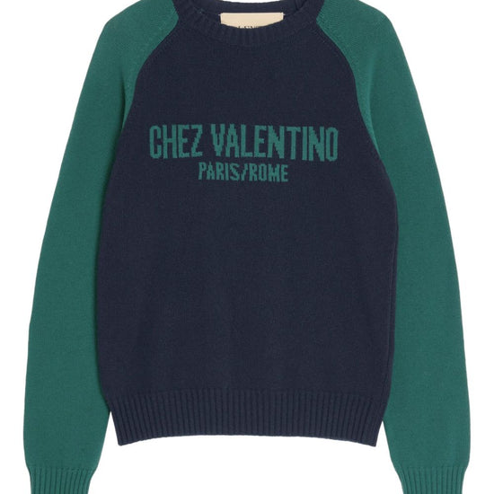 Navy blue intarsia-knit logo ribbed trim long raglan sleeves straight hem chez valentino wool sweater