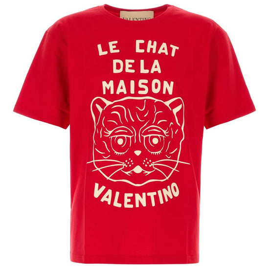Red front graphic featuring cat design le chat de la maison text detail crew neck short sleeves le chat de la maison cotton t-shirt