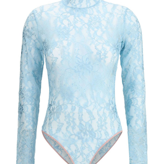 Light blue floral lace high neck long sleeves concealed rear zip fastening floral lace bodysuit