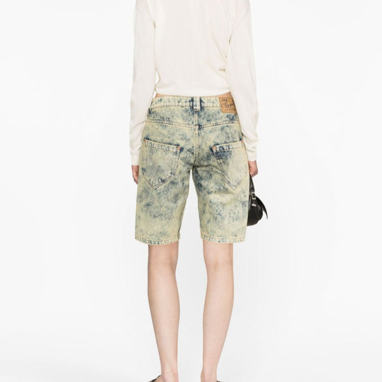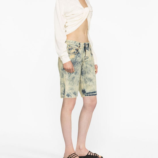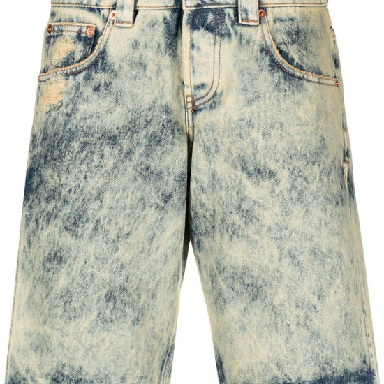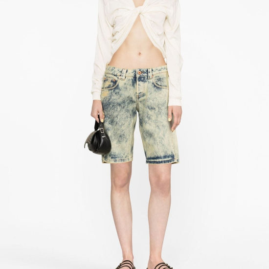 Logo-patch denim shorts from vaquera featuring blue, cotton, washed denim, logo patch to the rear, belt loops, front button and zip fastening, classic five pockets and knee-length. denim, c/spacco denim split shorts size and fit - this piece fits true to size. we recommend you get your regular size. model is 1,75m / 5ft 8in wearing size 27 (waist cm)