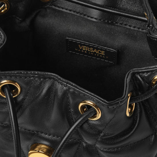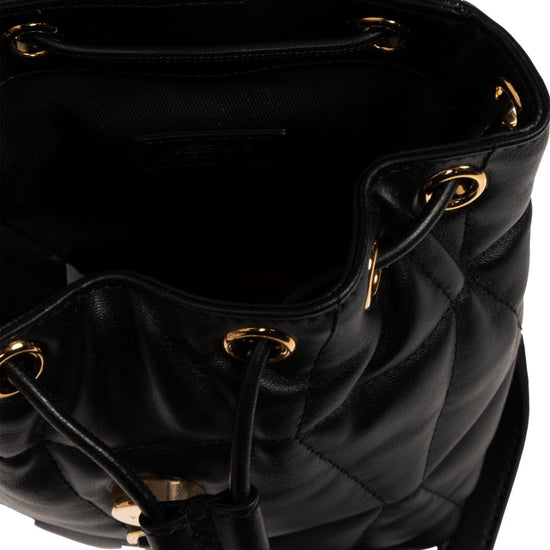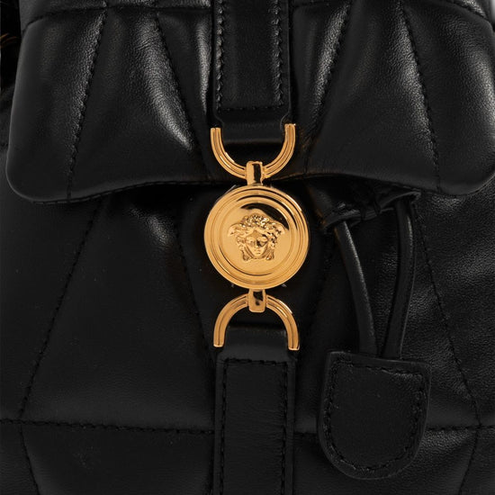 Black quilted gold-tone hardware top handle drawstring fastening adjustable shoulder straps kleo leather backpack