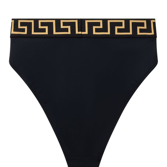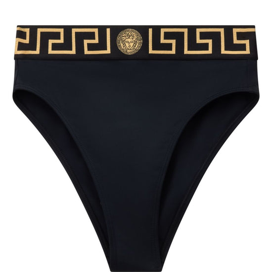 Black stretch-design high-waisted medusa head motif elasticated logo waistband be mindful to try on swimwear over your own garments. greca high waist bikini bottom size and fit - this piece fits true to size. we recommend you get your regular size. model is 1,75m / 5ft 8in wearing size 1 (num)