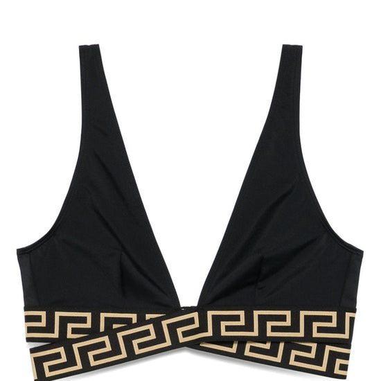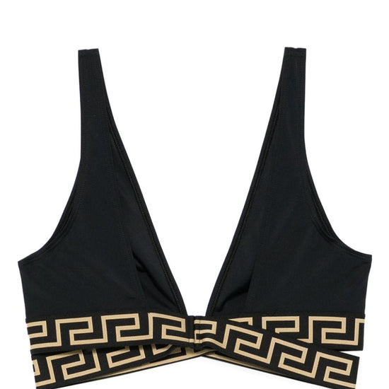 Black/gold colored, stretch design, layered design, signature greca detail, triangle cup, v-neck, elasticated band. greca triangle bikini top size and fit - this piece fits true to size. we recommend you get your regular size. model is 1,75m / 5ft 8in wearing size 1 (num)