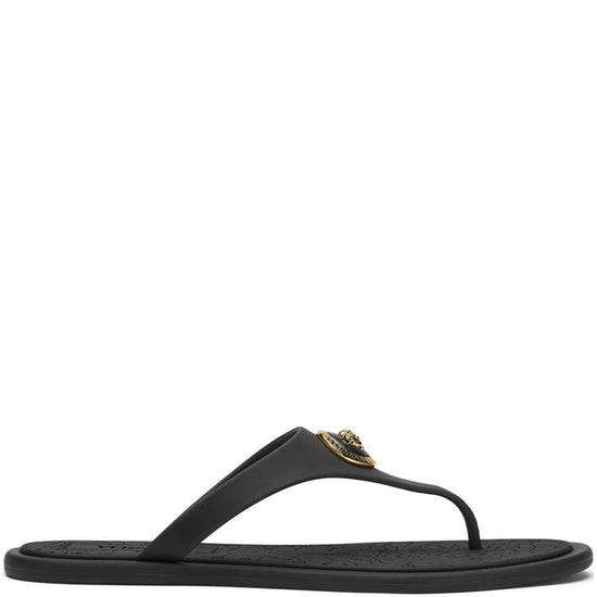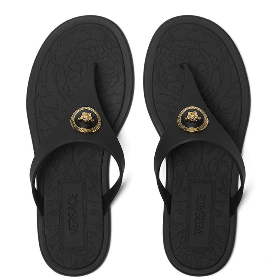 Black medusa head motif slip-on style thong strap round open toe branded insole flat sole alia thong sandals