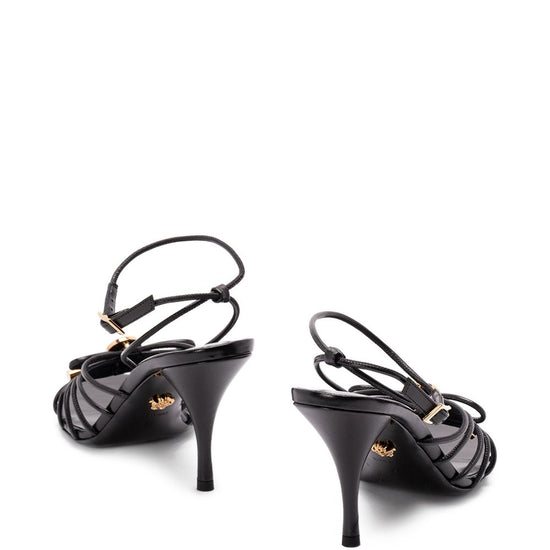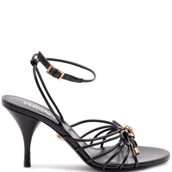 Black leather medusa head appliqué strappy design stiletto heel buckle fastening opera bow leather heel sandals