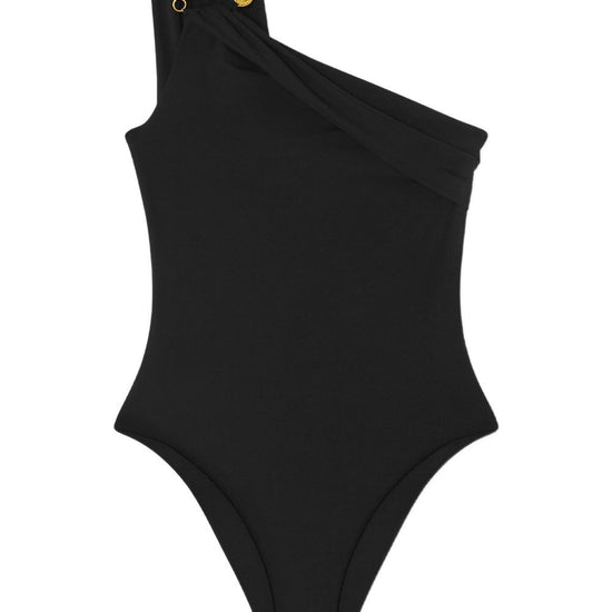 Black one-shoulder high cut signature medusa safety pin detail be mindful to try on swimwear over your own garments. safety pin swimsuit size and fit - this piece fits true to size. we recommend you get your regular size. model is 1,75m / 5ft 8in wearing size 1 (num)