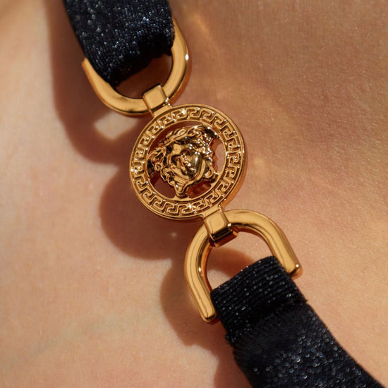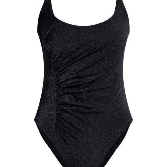 Black ruched detail medallion detail shoulder straps scoop back be mindful to try on swimwear over your own garments. la medusa swimsuit