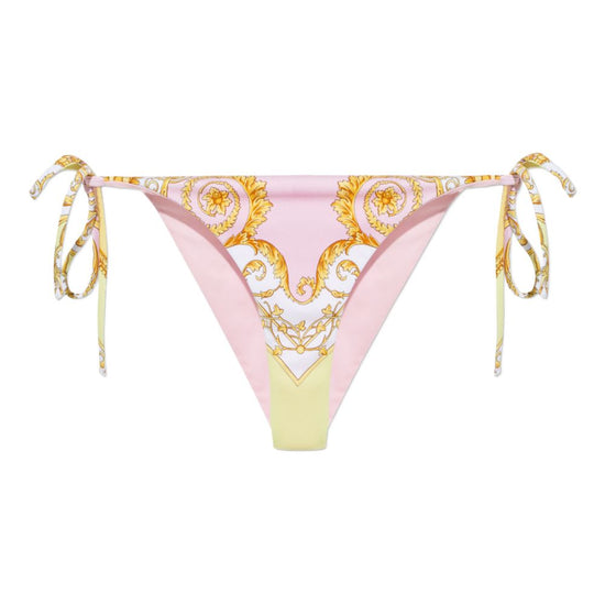 Light pink and yellow floral print tie side fastening be mindful to try on swimwear over your own garments. barocco print bikini bottom