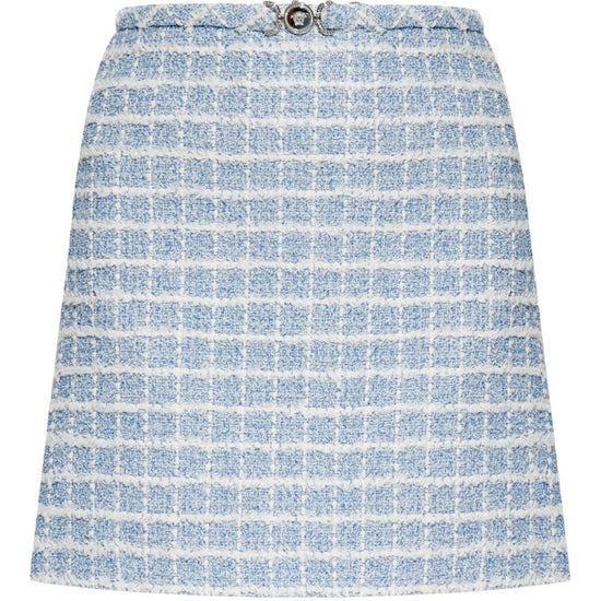 medusa plaque detail tweed mini skirt size and fit - this piece fits true to size. we recommend you get your regular size. model is 1,75m / 5ft 8in wearing size 40 (it)