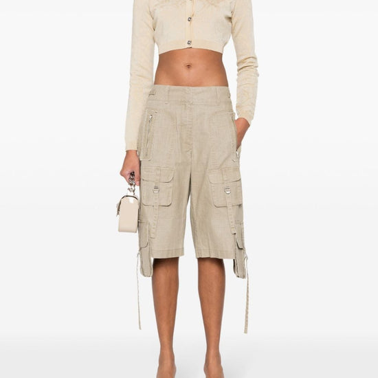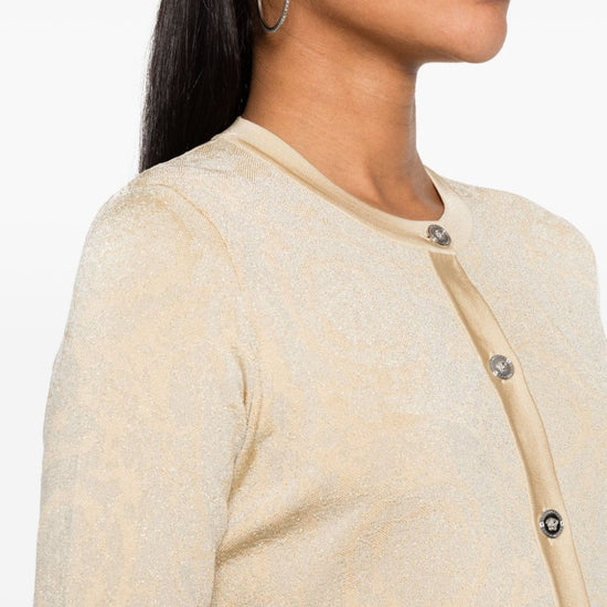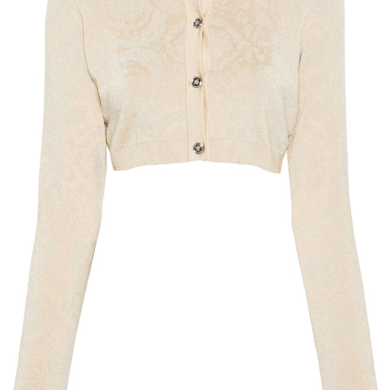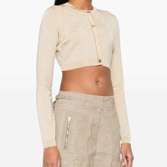Light beige knitted construction signature barocco pattern lurex detailing signature medusa head buttons round neck long sleeves cropped straight hem front button fastening barocco texture cropped cardigan size and fit - this piece fits true to size. we recommend you get your regular size. model is 1,75m / 5ft 8in wearing size 40 (it)