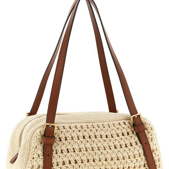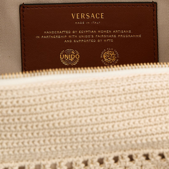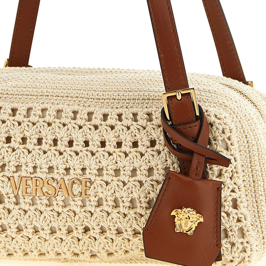 Crochet raffia shoulder bag with contrast nappa leather details, bowling pattern, front metal lettering logo, double adjustable handle, top zip closure, leather 'versace tag' with removable front metal 'medusa'.