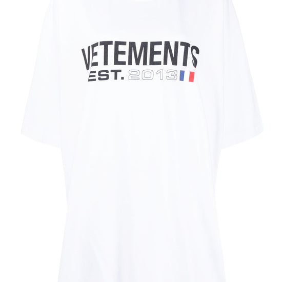 Logo-print cotton t-shirt from vetements featuring white, cotton, logo print to the front, crew neck, oversize arms, drop shoulder, short sleeves, straight hem and thigh-length. logo cotton t-shirt size and fit - this piece fits true to size. we recommend you get your regular size. model is 1,75m / 5ft 8in wearing size s