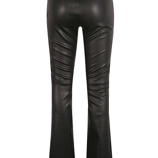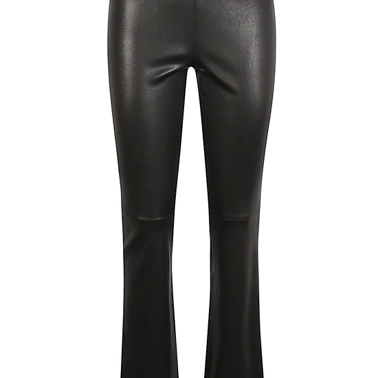 Black colour, made of leather, high elasticated waist, wide leg, decisive stitching, two side welt pockets. leather flared leg trousers