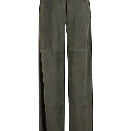 Dark green colour, made of leather, high elasticated waist, wide leg, decisive stitching, two side welt pockets. suede leather trousers