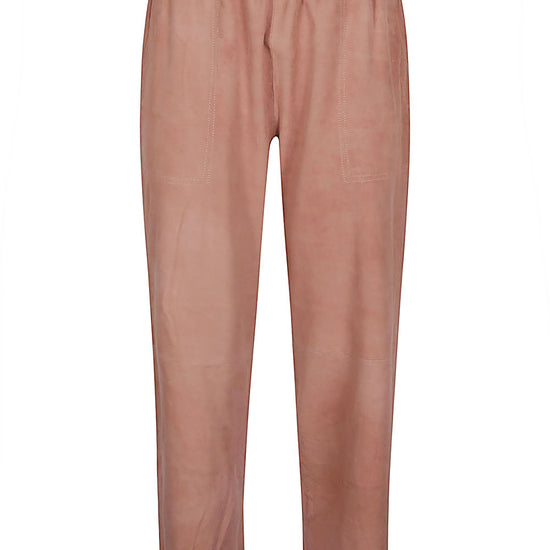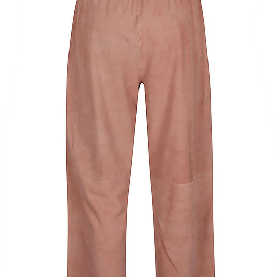 Pantaloni in pelle veri rosa, taglio largo, coulisse in vita e due tasche laterali a filetto. suede leather trousers size and fit - this piece fits true to size. we recommend you get your regular size. model is 1,75m / 5ft 8in wearing size 40 (it)