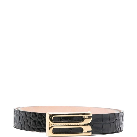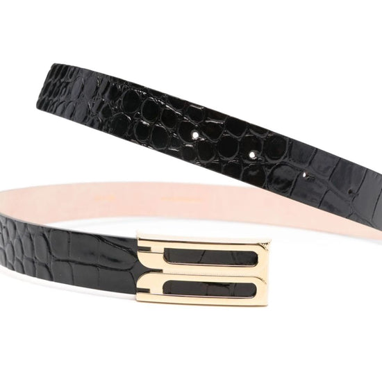 Black gold-tone buckle croco-embossed detail adjustable length notches for fastening frame leather belt