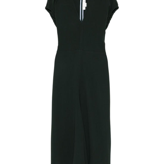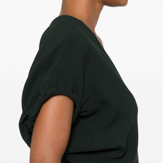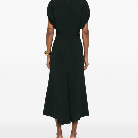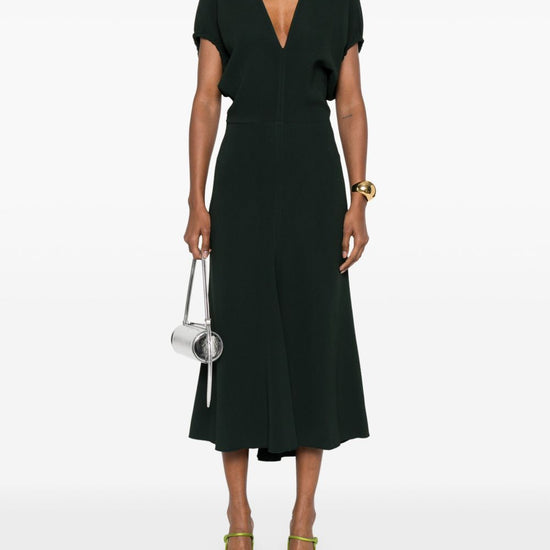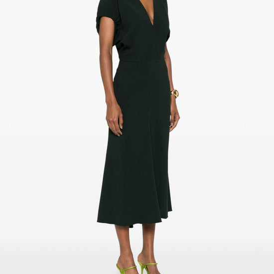 Dark green rear zip fastening v-neck short sleeves fitted waistline midi dress size and fit - this piece fits true to size. we recommend you get your regular size. model is 1,75m / 5ft 8in wearing size 8 (uk)