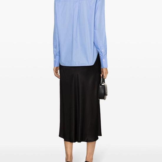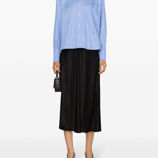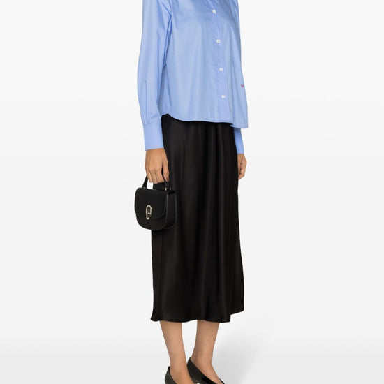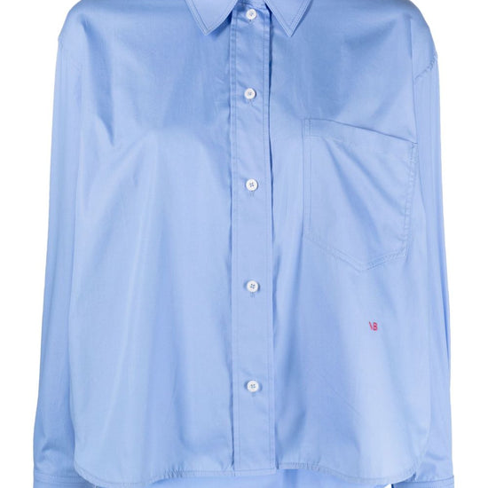 Oxford blue organic cotton poplin texture embossed logo to the front inverted pleat classic collar front button fastening long sleeves buttoned cuffs rear curved hem cotton cropped shirt size and fit - this piece fits true to size. we recommend you get your regular size. model is 1,75m / 5ft 8in wearing size 8 (uk)